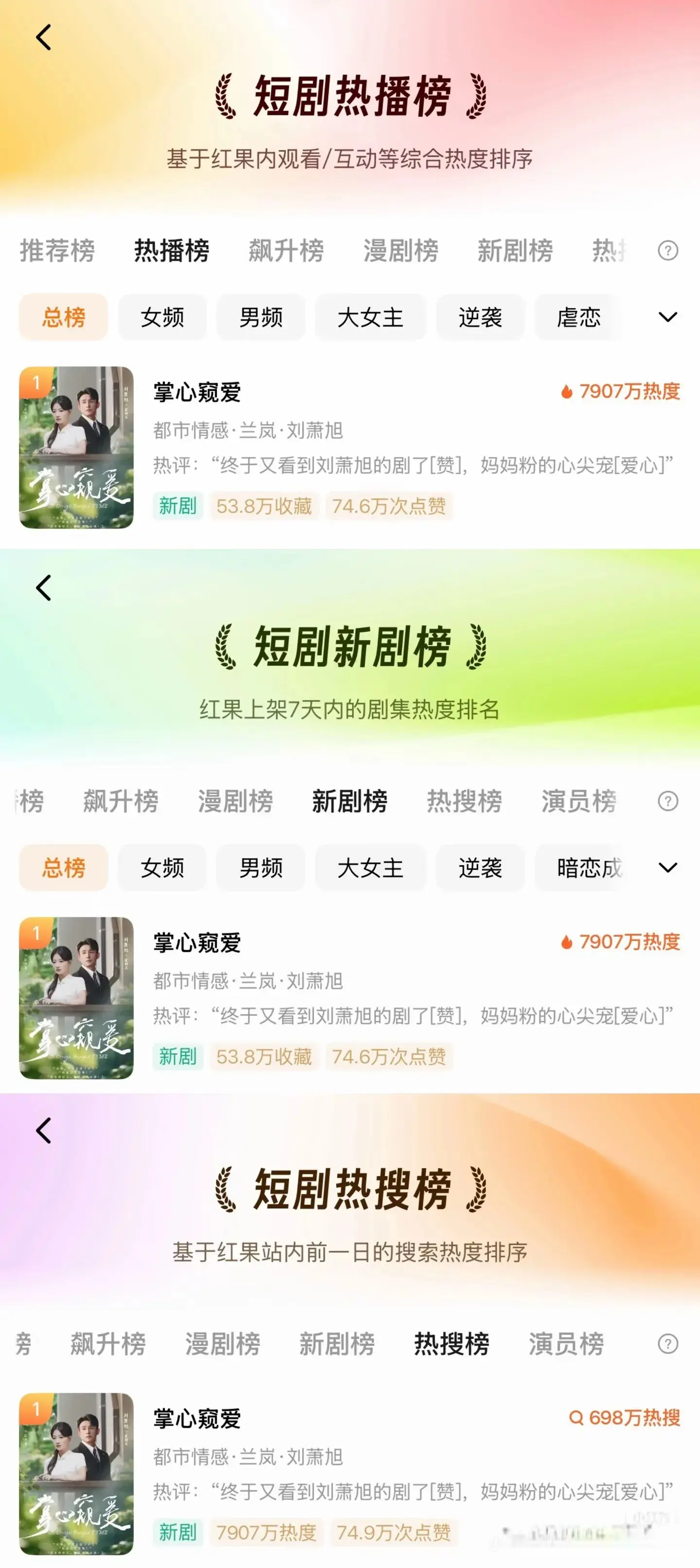 11月20号《掌心窥爱》刚上线,首日热度就飙到7907万,直接登顶三大榜单,